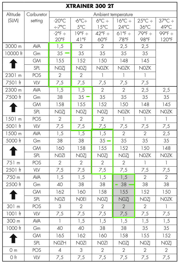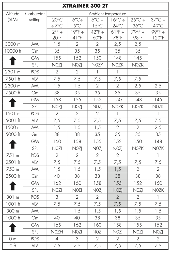 Below you see a copy of Beta’s Xtrainer jetting chart. The shaded area is the stock setting. You can see as altitude increases, jetting gets leaner but for the same altitude, as the temperature gets colder, jetting gets richer. A NOZJ needle is richer than a NOZK needle.