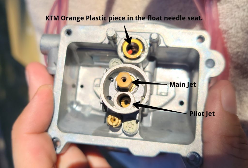 Yup, that is some (KTM) orange piece of plastic in the float needle seat! This kept the float from moving overflowing fuel. We cleaned that out and out the carb back in. It started up(yay!) and we took it for a test ride…no more fuel pissing out the overflow! But, too early to celebrate as the bike would not idle. Idle is handled by the pilot jet so we took out the stock #38 and out in a #40 that the bike came with. Voila! The bike now idles and runs pretty well. The other recent change we made was installing a Suziki NEDW needle as I had read a few others like the way this needle runs on their KTM 250 2-stroke.